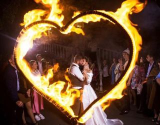 Огненные сердца отличаются от пиротехнических, тем, что их можно зажечь самостоятельно, молодоженами. Что дает еще больше романтики на свадьбе. Такой нежный и трепещущий момент, когда жених, нежно берет за руку невесту, они подходят к огненному сердцу, поджигают его специальным огненным факелом. И сердце начинает гореть. Очень красиво, по всему периметру конструкции. Его конструкция состоит из огнеупорного каната на стальном каркасе. Что делает огненное сердце безопасным в использовании.
